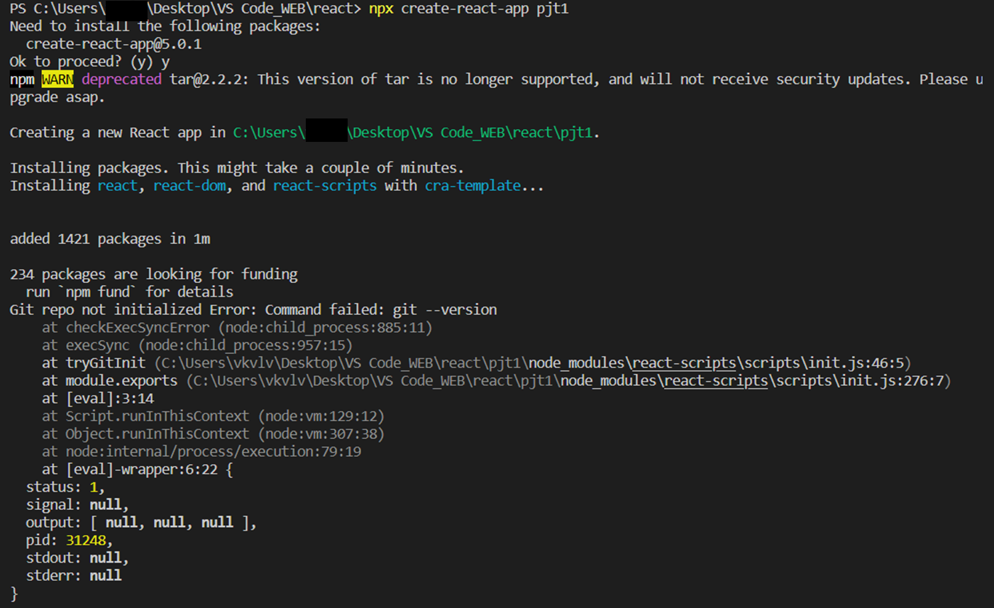 ▶ npx 설치가 완료된 후에는 Create React App을 진행해주면 된다.