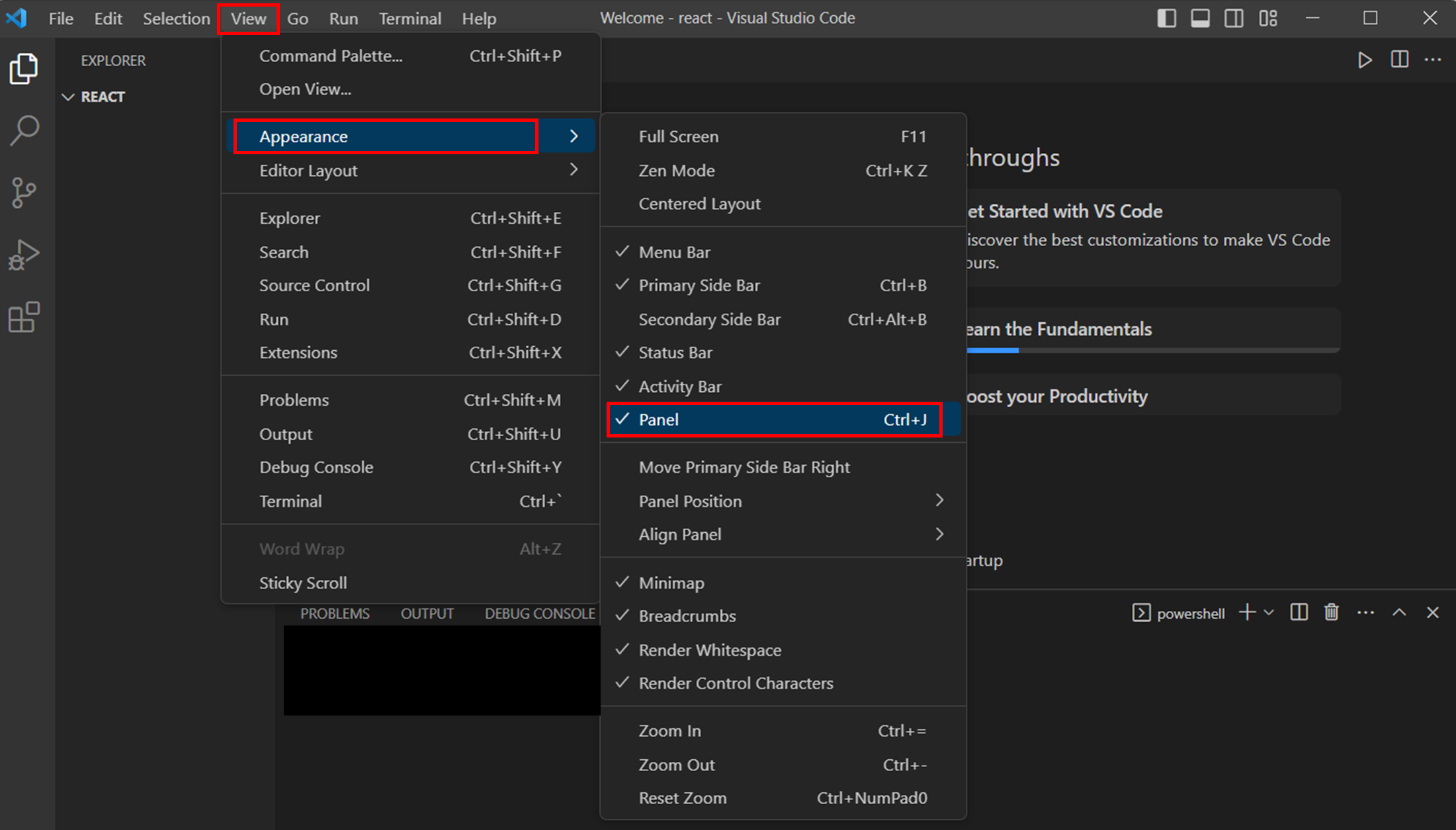 ▶ Create React App 설치를 위해 Terminal을 연다.