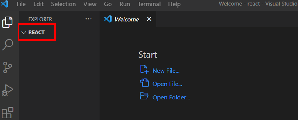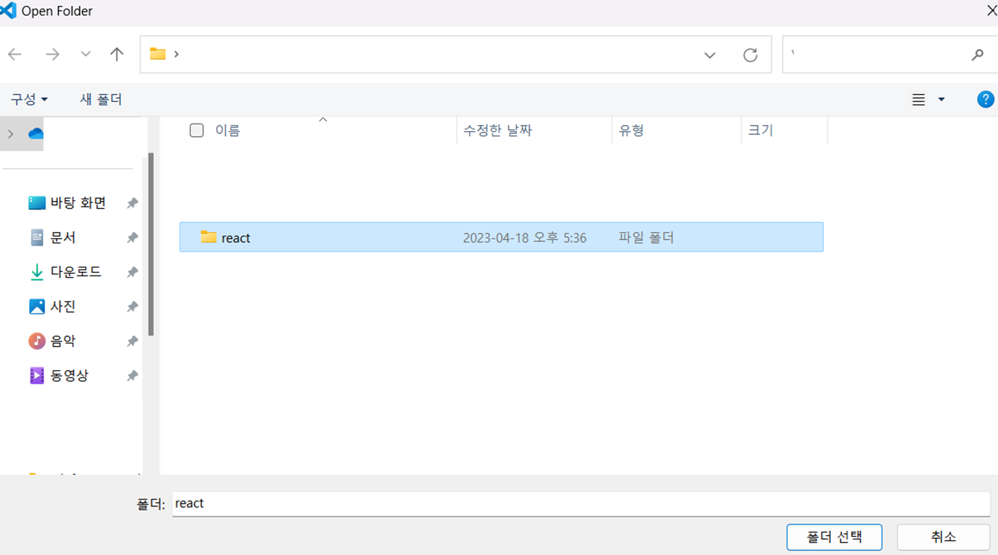 ▶ 여기서는 'react' 이름으로 새 폴더를 생성하여 선택하였다.